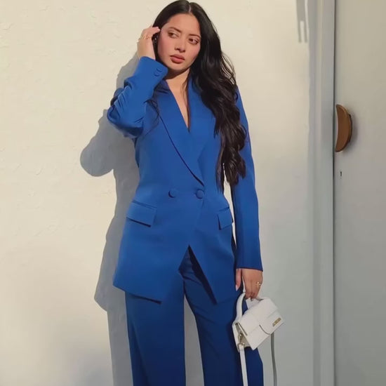 Look sharp and professional in our Blue Pantsuit. Crafted from Luxury Crepe, it's lightweight yet durable for all day comfort. The perfect choice for the office or special occasions.