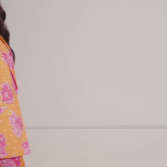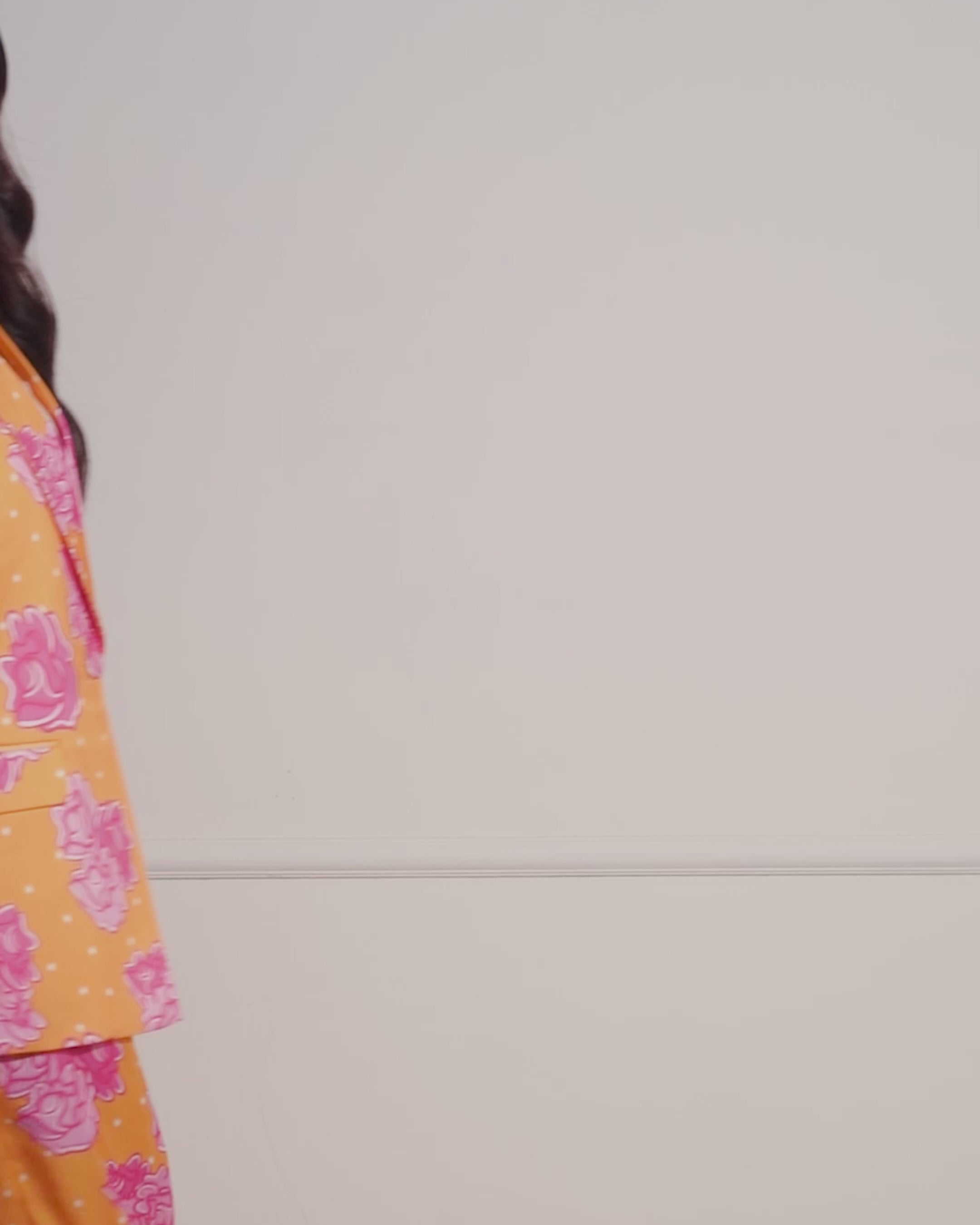 Printed pantsuit with delightful floral print and discreet shoulder padding, a lapel collar, front flap pockets, soft fabric lining, and precise pasting ensure a flawless fit. Paired with matching pants for a complete look.