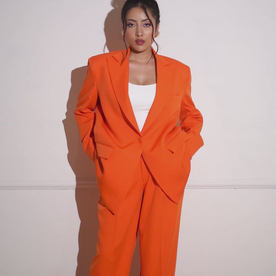 An oversized pantsuit with a classic lapel collar and handy front flap pockets. Extra attention to detail with smooth lining underneath and infused pastings with padded shoulders.