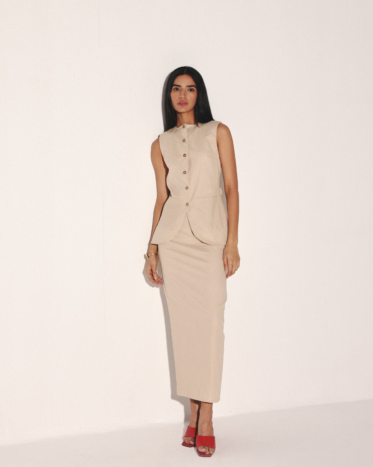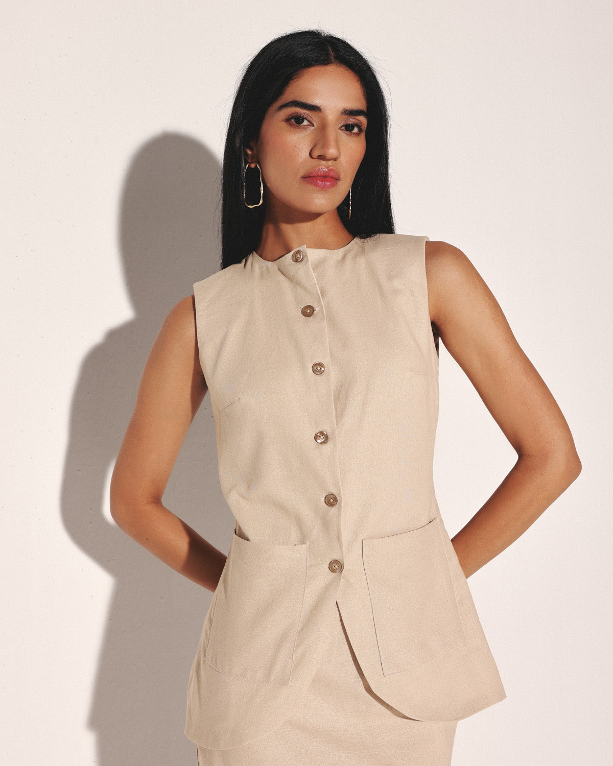Our top features a high neckline with a clean button-down front, subtle shaping at the waist, and a tie-back detail that allows for an adjustable, cinched silhouette.